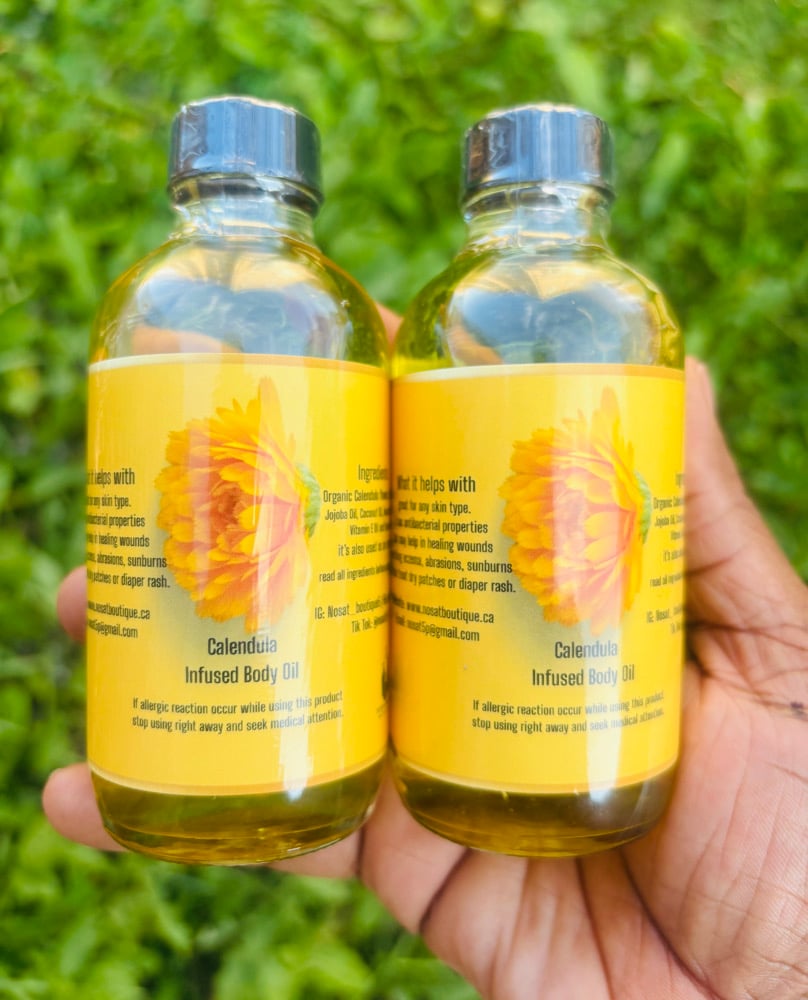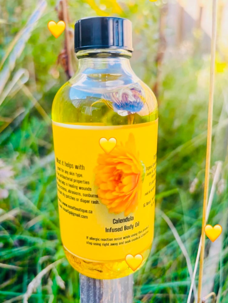 Calendula infused body oil. Works well on any skin type. This Oil can be used at anytime of the day. It is great for smoothing eczema, Razor bumps, abrasions, sunburn, dry patches, and also great for diaper rush. It has antibacterial properties that may also help in healing wounds.